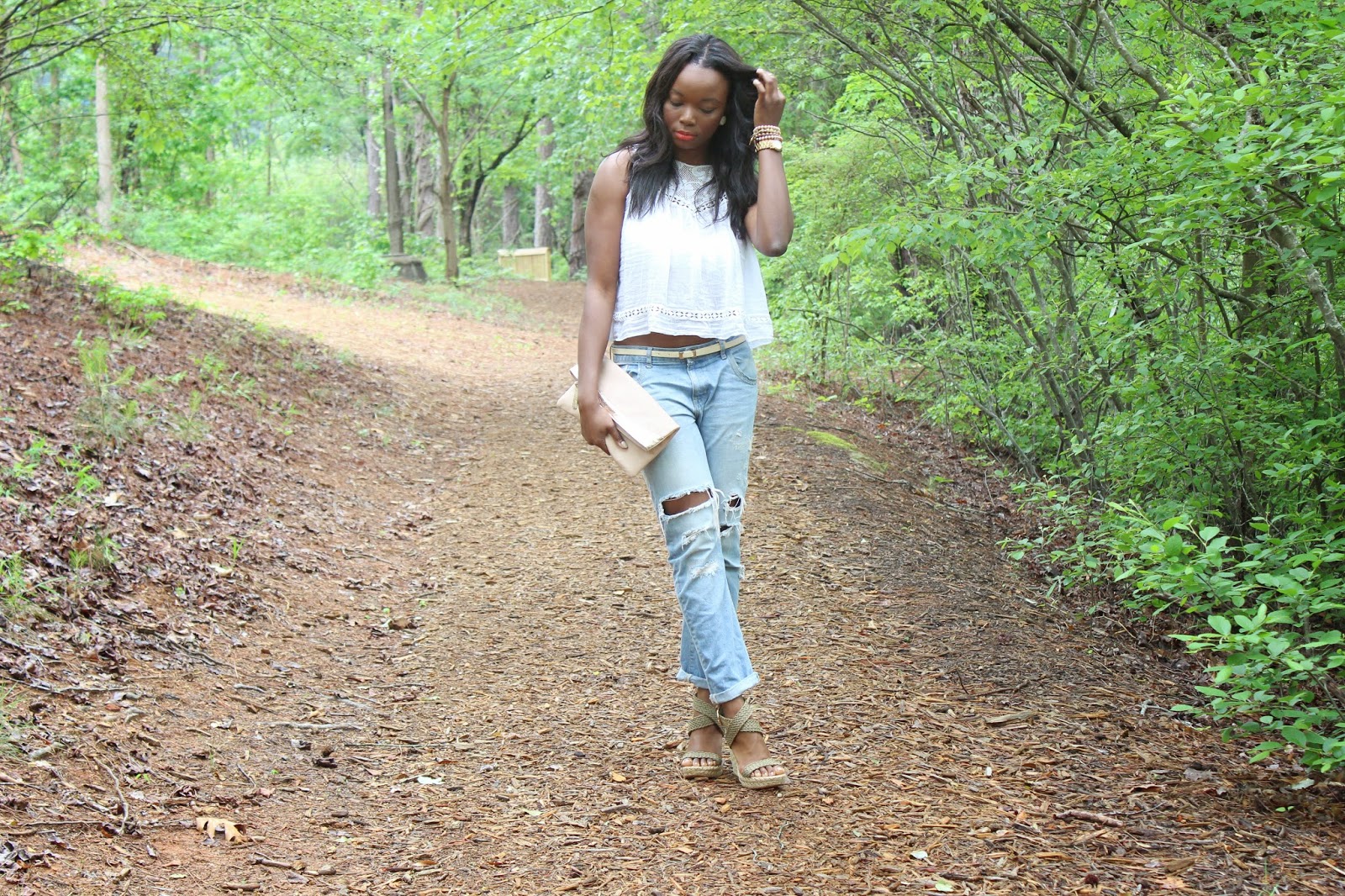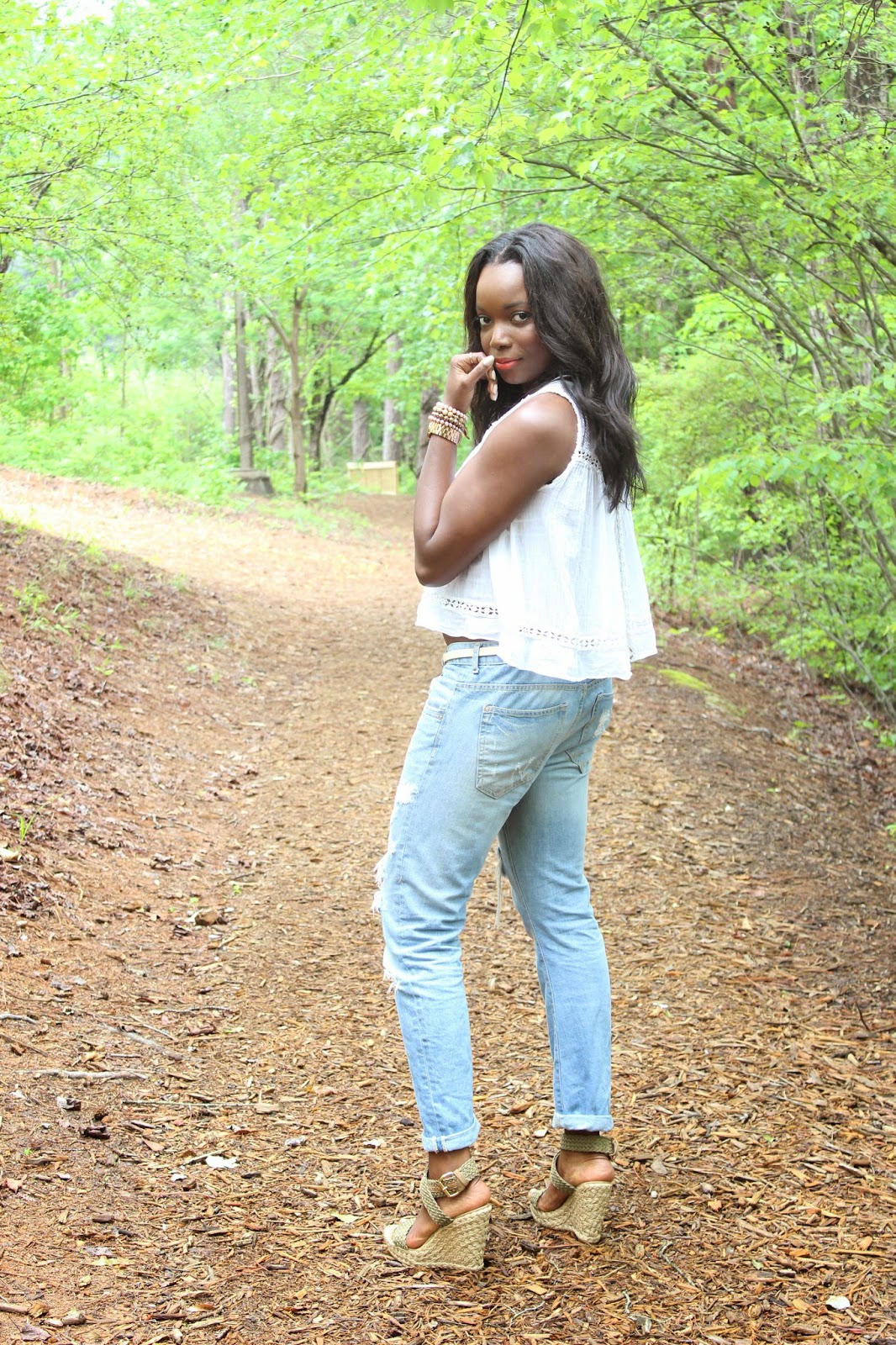 Talk about the perfect weekend uniform. Comfort is key, and what better way to achieve it than in my boyfriend jeans, a flowy cami and wedges?