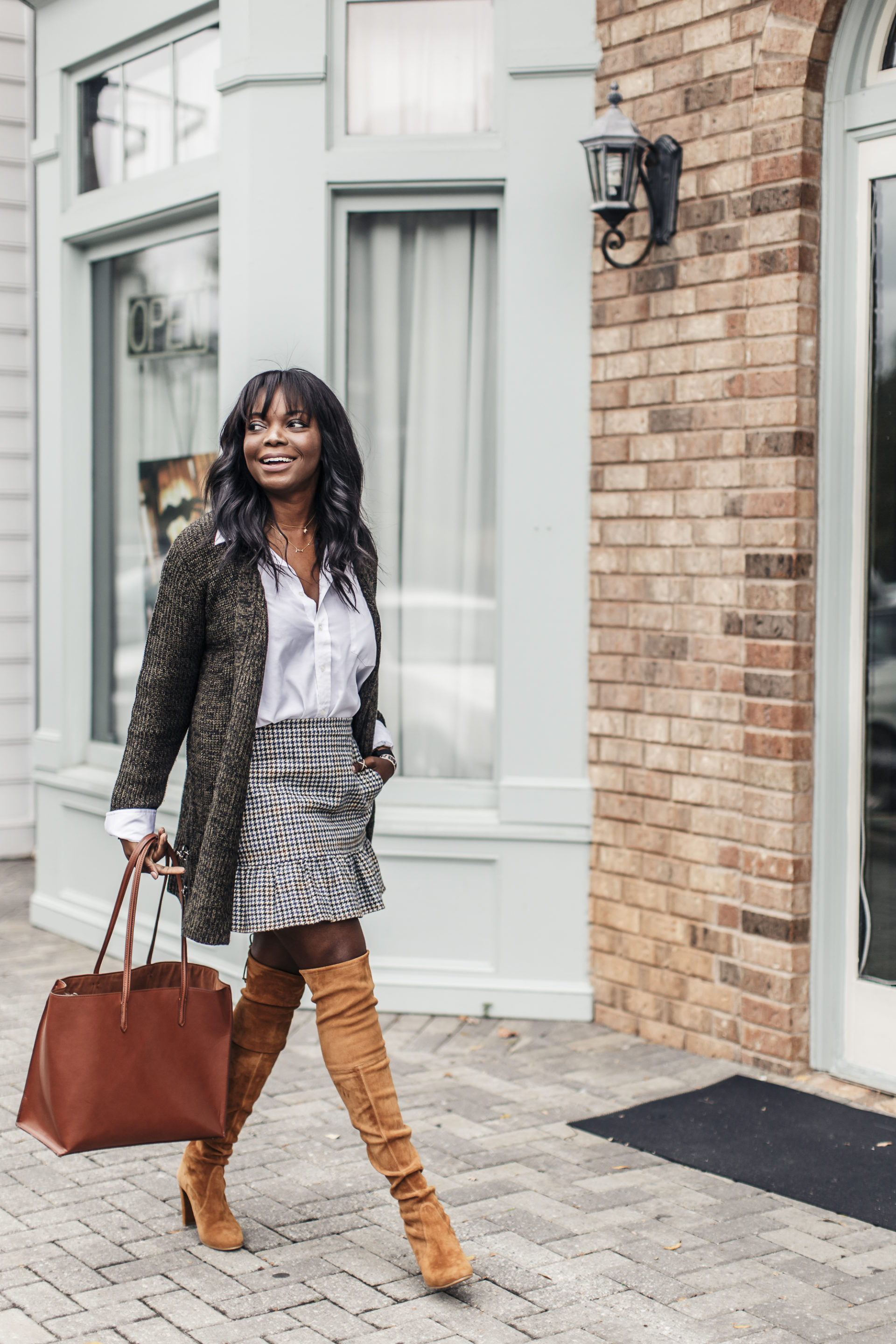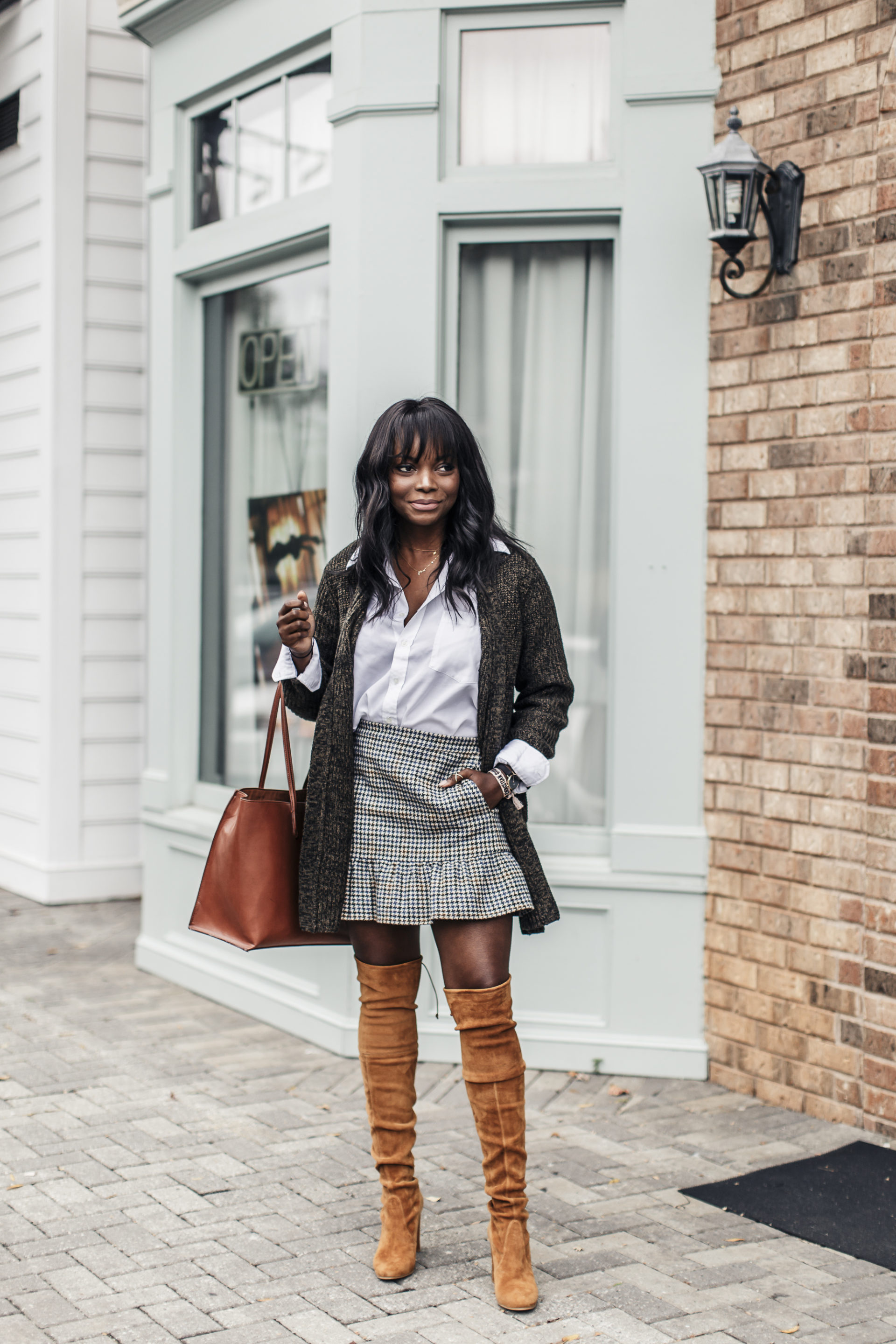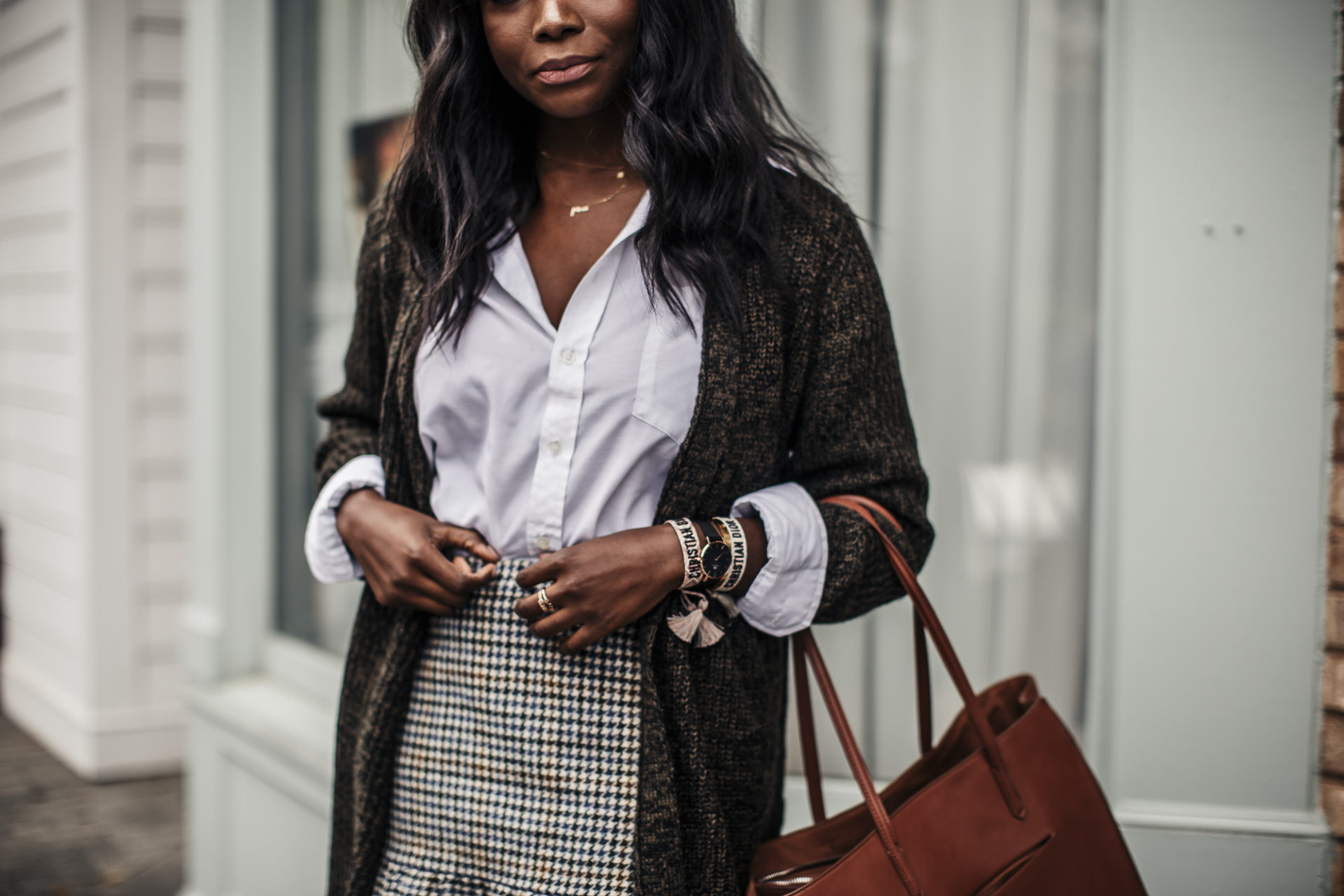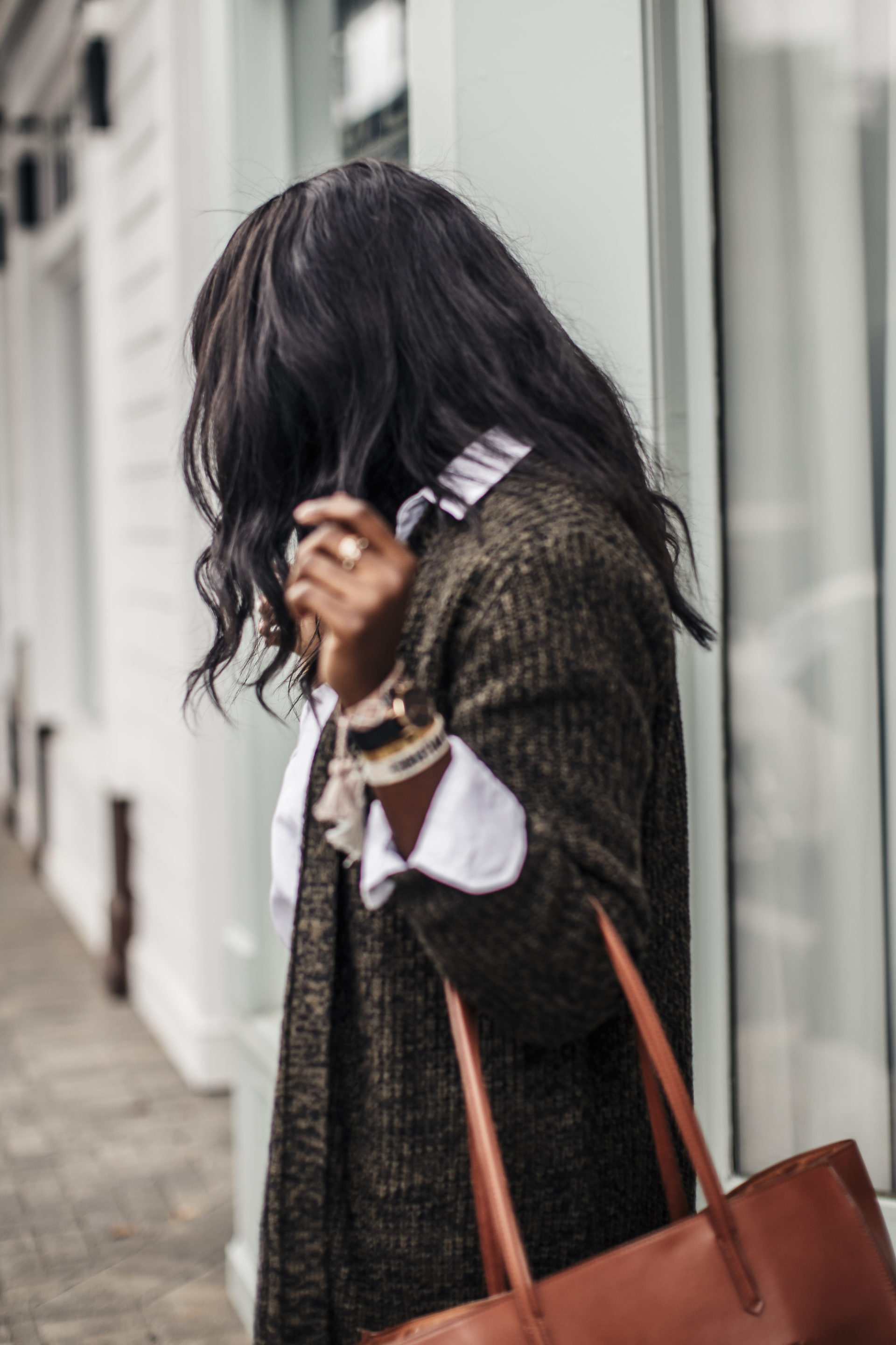 If this olive green cardigan looks familiar, it’s definitely because it is… and I kind of love you for recognizing it, cause it means you’ve been reading this little blog here for a minute or two! It’s my favorite sweater right now, and you probably recognize it from one of my recent posts where I styled my favorite South Moon Under knits and denim. I love the over-sized fit, it’s SUPER soft… and clearly it can be dressed down with jeans, or dressed up with your favorite skirt and button-down shirt (the shirt is my mom’s by the way… I love pulling pieces from her wardrobe, and she always leaves a lot behind whenever she comes to visit from Nigeria)!Speaking of dressing up, how perfect would this look be for your Thanksgiving dinner this year? I don’t always go for super preppy looks like this, but when the mood strikes, they are make for such an easy-to-wear look that’s great for work and semi-formal meetings and dinner events.