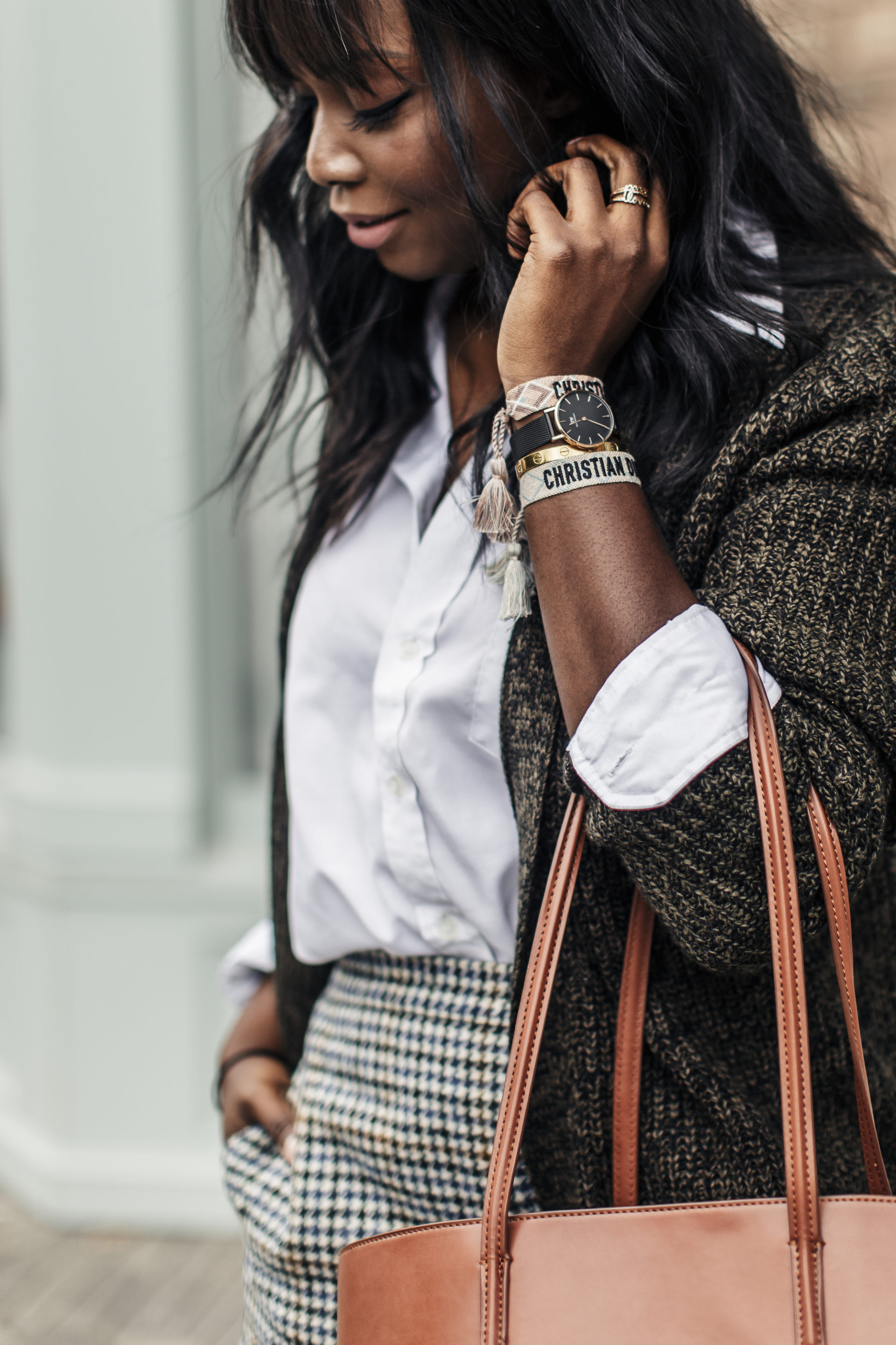Button-down shirt (similar) // J’Adior woven bracelets // Leather tote (similar)