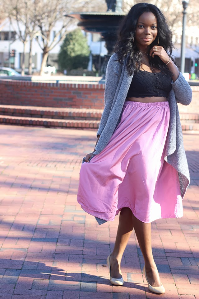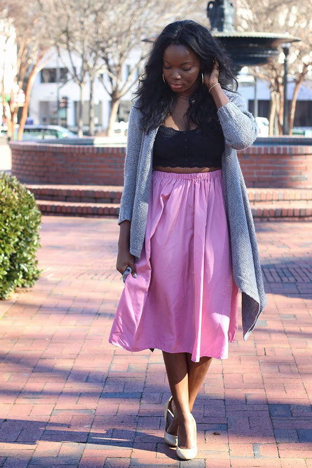 Channeling my inner Mary Kate Olsen with oversized layers, while featuring the 2014 color of the year (Radiant Orchid) in this gorgeous satin skirt I recently added to my wardrobe the other day. I absolutely love the feminine look of midi-skirts paired with heels, and after searching for the longest time, I finally have a midi skirt of my very own 🙂 I wore this out to run weekend errands, and I couldn’t be more grateful for the “security blanket” my oversized cardi provided for me while I’m in the process of working off the extra holiday pounds… do you spy the Free People cropped bra I featured in my last post? 😉