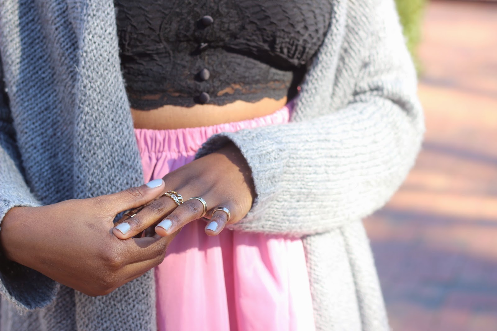 Free People x Juliet cropped bra | Forever 21 cardigan | Urban Outfitters skirt | Marc by Marc Jacobs crossbody turnlock bag | AJ Morgan sunglasses | Steve Madden heels | H&M jewelry | MAC Cosmetics “Taupe” | China Glaze “Pelican Gray”