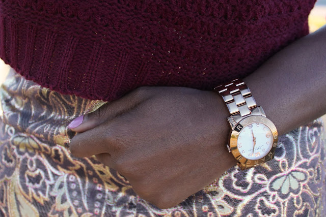 I thought the off-white color of the shoes would match well with a burgundy/rose-gold color palette, and I love the contrast of the softer knit sweater on the harsh metallic jacquard shorts.