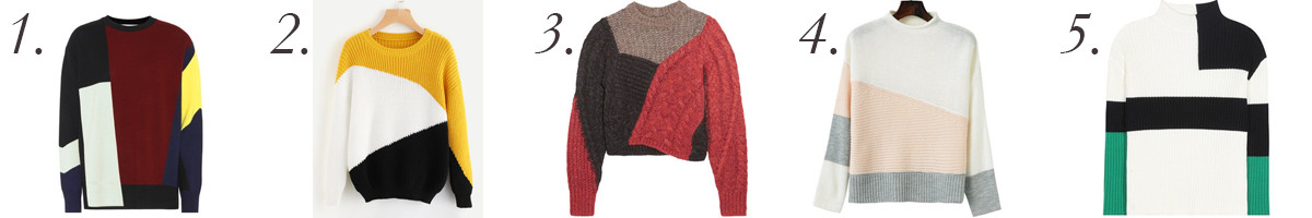 Which color block sweater would you get? Pick your favorite from my top 5 selection of on-trend knitwear, and click through to shop! To complete your Fall-ready look, make sure you pull out your favorite pair of denim, or a skirt with knee-high boots… you’ll be killing this trend in no time![/two_third][one_sixth_last padding="0 0 0 5px"] [/one_sixth_last]