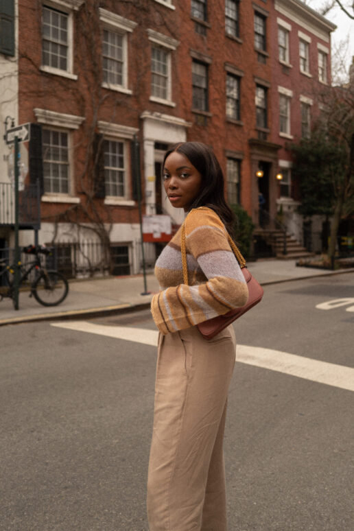 Everyday classic crisp button-ups are the perfect transitional piece to base a quick outfit around. For more fitted layering pieces, I’m really liking SKIMS bodysuits and t-shirts. Knit vests are also having a major moment!