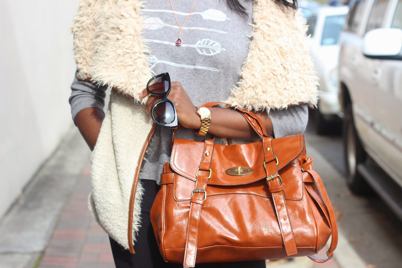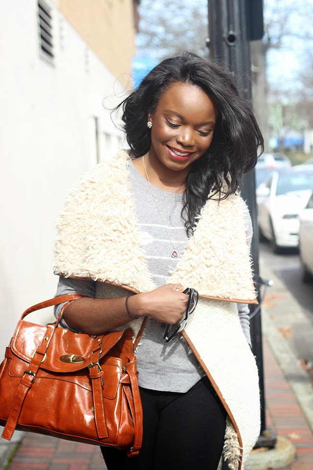I JCrew sweater | Joes Jeans pants | Love Tree shearling vest | Jeffrey Campbell sandals | Prada sunglasses | Express necklace